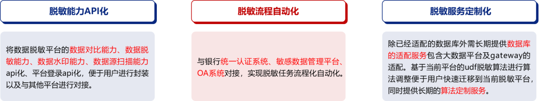 ■?通過與客戶4A平臺(tái)、數(shù)據(jù)資產(chǎn)管理平臺(tái)、OA平臺(tái)進(jìn)行對(duì)接整合,實(shí)現(xiàn)數(shù)據(jù)脫敏導(dǎo)數(shù)流程的線上化與自動(dòng)化,導(dǎo)數(shù)耗時(shí)縮短80%以上。