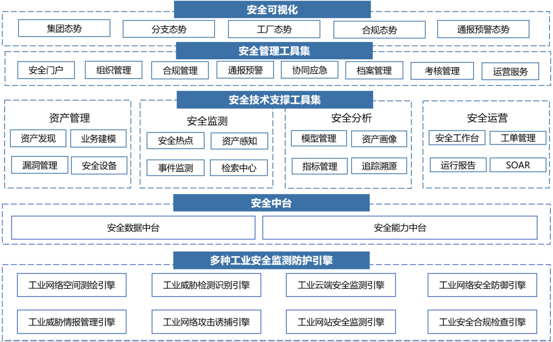 安全引擎層為平臺運行提供必要的基礎(chǔ)安全能力和數(shù)據(jù)來源,包括工業(yè)網(wǎng)絡(luò)資產(chǎn)測繪引擎、工業(yè)威脅檢測識別引擎、工業(yè)網(wǎng)絡(luò)攻擊誘捕引擎、工業(yè)網(wǎng)絡(luò)防御引擎、工業(yè)威脅情報管理引擎等。
