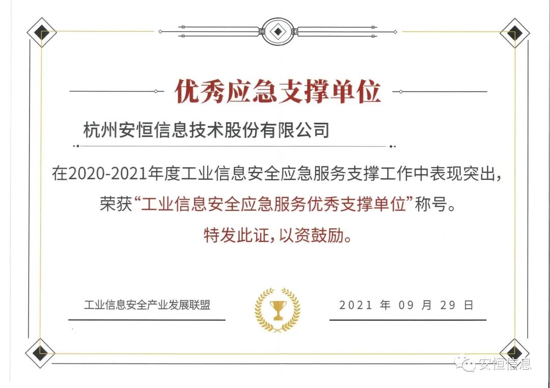 在上一年度的工業(yè)信息安全應(yīng)急服務(wù)支撐過(guò)程中的突出表現(xiàn)和專業(yè)服務(wù),被評(píng)為優(yōu)秀支撐單位。