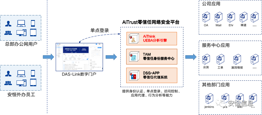 AiTrust解決方案一期項(xiàng)目可對(duì)接公司DASLink、上網(wǎng)認(rèn)證、OA、Mail、禪道、銷(xiāo)售易等30+應(yīng)用系統(tǒng),于2021年12月31日正式上線(xiàn),首日活躍用戶(hù)2000+人。