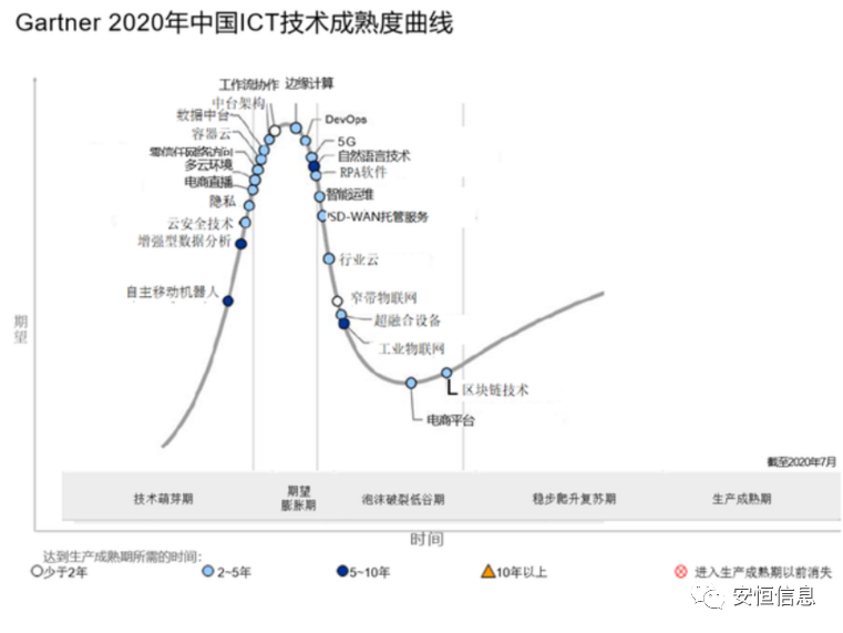 Gartner 《2021年中國ICT技術(shù)成熟度曲線報(bào)告》(Hype Cycle for ICT in China,2021 )橫向維度按照技術(shù)成熟度分為從新興到成熟的5個(gè)階段,縱向維度表現(xiàn)該技術(shù)的期望值。此次ICT成熟度曲線對(duì)AIOps平臺(tái)、數(shù)據(jù)中臺(tái)、5G、低代碼、容器即服務(wù)、多云、云安全、邊緣計(jì)算等20多項(xiàng)新型有重大發(fā)展價(jià)值的技術(shù)進(jìn)行分析。