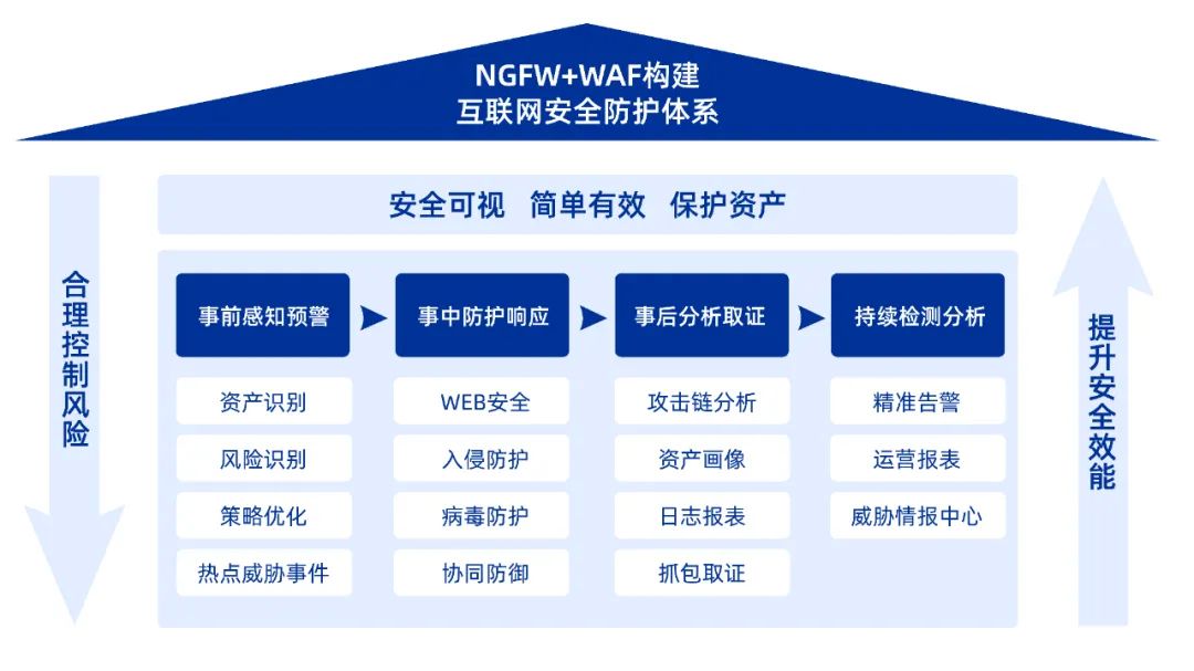 秉持安全可視、簡單有效的理念,互聯網出口安全檢測聯合解決方案通過明御安全網關與明御WEB應用防火墻以資產為視角,構建全流程防御的互聯網出口安全防護體系,并融合入侵防御、病毒防護、上網行為管控、VPN、威脅情報等安全模塊。