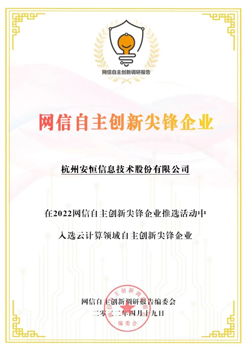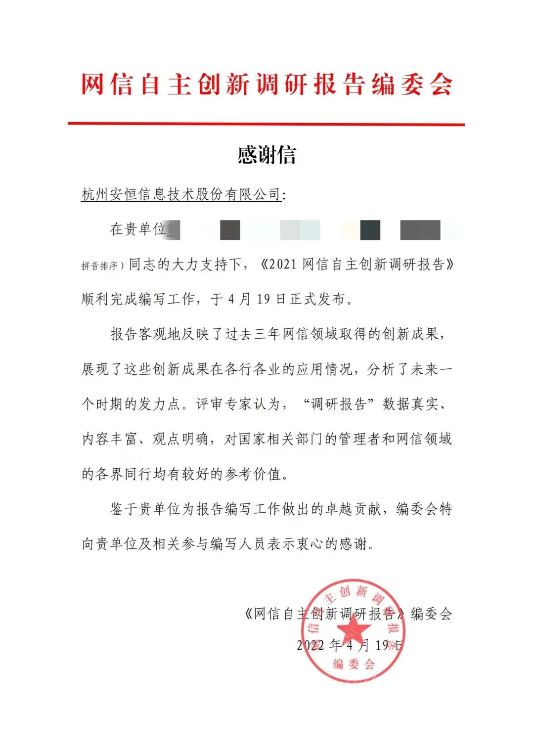 收獲編委會感謝信,安恒信息入選網(wǎng)信自主創(chuàng)新尖峰企業(yè)