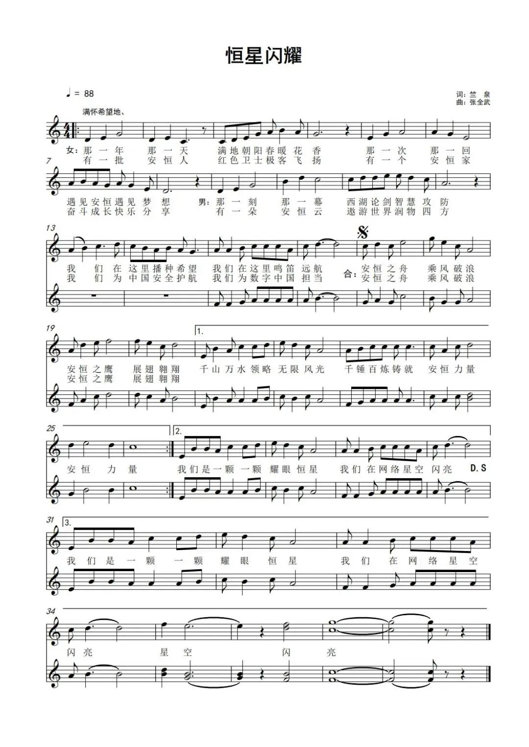 早在兩年前,你們的董事長范淵先生就和我說,要在安恒信息15周年之際推出一首司歌,并希望我來填詞。這是范淵先生對企業(yè)文化發(fā)展的深謀遠慮。在歌詞創(chuàng)作過程中,我回顧了安恒信息的發(fā)展歷程,范淵先生艱苦創(chuàng)業(yè)的初心、經(jīng)營企業(yè)的智慧、回報社會的情懷。正是在他帶領(lǐng)下,安恒信息如今成長為網(wǎng)絡(luò)信息安全領(lǐng)域的領(lǐng)軍者之一。這些年來,安恒信息參與了近乎全部國家重大網(wǎng)絡(luò)安保,實現(xiàn)了零失誤,為中國安全護航,為數(shù)字中國擔當。如果把數(shù)字世界比喻為浩瀚的宇宙,那么安恒信息就是一顆閃耀的恒星,不斷發(fā)光發(fā)熱,遨游宇宙星空。安恒人在千錘百煉中造就了自己獨特精神文化。我在歌詞中寫到,“我們是一顆耀眼恒星,我們在網(wǎng)絡(luò)星空閃亮”。希望安恒信息在數(shù)字安全星空里永遠閃爍光彩奪目的輝煌。