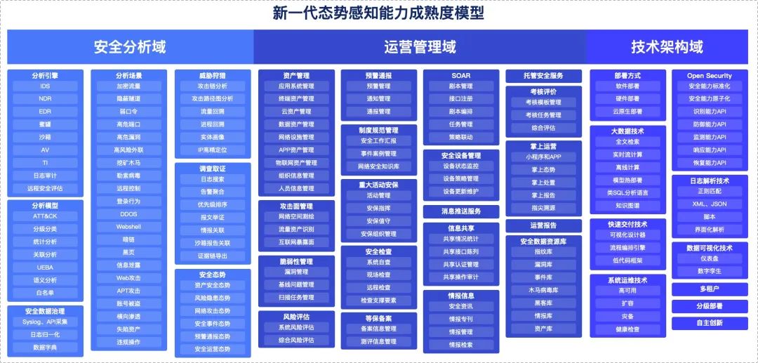 本次發(fā)布會(huì)上,安恒信息結(jié)合長達(dá)6年態(tài)勢(shì)感知實(shí)踐,基于近3000家中大型企業(yè)的安全分析與運(yùn)營實(shí)戰(zhàn),提煉出新一代態(tài)勢(shì)感知建設(shè)成熟度模型。該模型從安全分析域、運(yùn)營管理域以及技術(shù)架構(gòu)域三個(gè)層面數(shù)十種安全能力維度對(duì)新一代態(tài)勢(shì)感知建設(shè)進(jìn)行評(píng)估,從而指導(dǎo)政企進(jìn)行新一代具備安全運(yùn)營能力的態(tài)勢(shì)感知建設(shè)和評(píng)估。