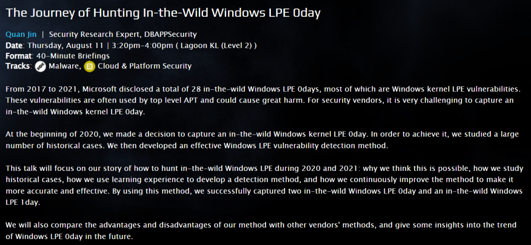 8月12日,安恒信息的研究成果《Windows本地提權(quán)在野0day狩獵之旅》在BlackHat USA 2022大會上發(fā)布。