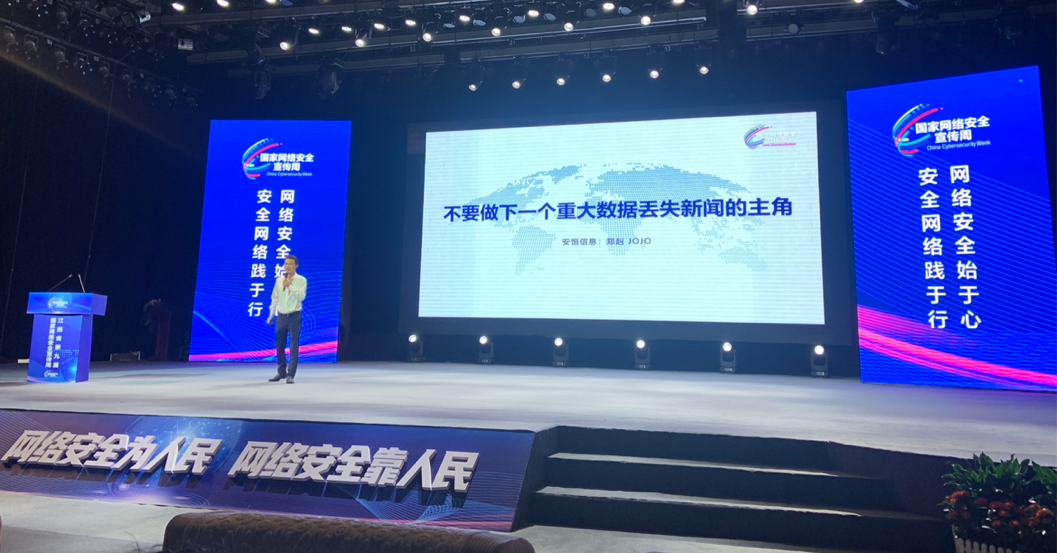 在江西網(wǎng)絡(luò)安全宣傳周上,安恒信息高級副總裁鄭赳參加了以“信創(chuàng)助力新動能網(wǎng)安護(hù)航新發(fā)展”為主題的網(wǎng)絡(luò)安全高峰論壇,并作《不要做下一個重大數(shù)據(jù)丟失新聞的主角》主題演講。