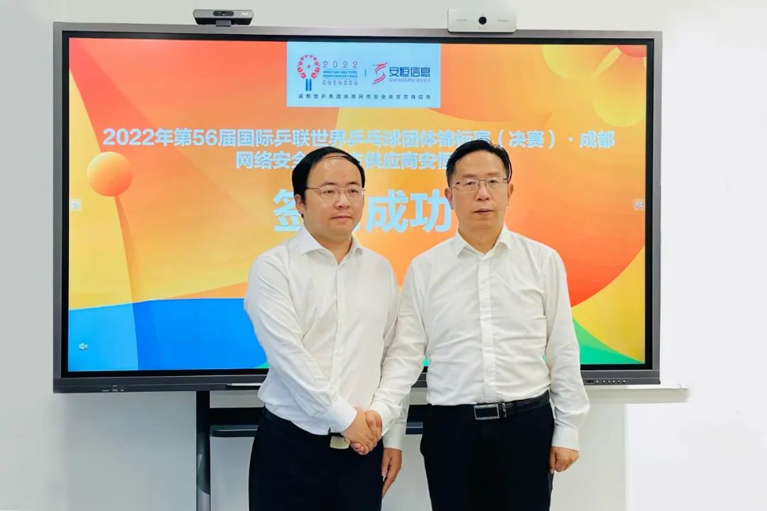 9月23日,第56屆國際乒聯(lián)世界乒乓球團體錦標(biāo)賽(決賽)·成都(簡稱成都世乒賽)簽約儀式在成都舉行。杭州安恒信息技術(shù)股份有限公司(以下簡稱安恒信息)正式成為成都世乒賽網(wǎng)絡(luò)安全類官方供應(yīng)商,確保成都世乒賽團體賽順利舉辦。成都世乒賽組委會賽事宣傳和推廣部副部長苗峪源、安恒信息高級副總裁吳永越代表雙方簽約。