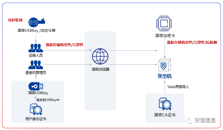 為落實國家政策,滿足各行業(yè)客戶對國密算法的需求,安恒堡壘機(jī)積極推進(jìn)國密改造計劃,在經(jīng)過多輪的市場調(diào)研、技術(shù)研討后,從多個維度完成堡壘機(jī)的國密改造。