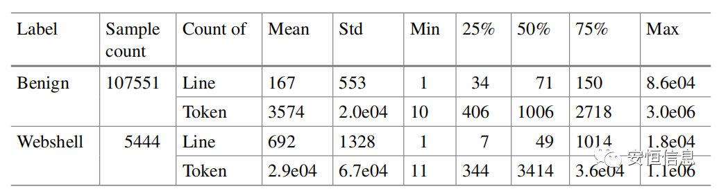 長(zhǎng)文本在webshell檢測(cè)領(lǐng)域是頻繁出現(xiàn)的,對(duì)已知webshell和正常樣本的代碼行數(shù)和token數(shù)統(tǒng)計(jì),一半以上的webshell代碼token個(gè)數(shù)超過(guò)3400,代碼行數(shù)超過(guò)49行,而一半以上的正常代碼token個(gè)數(shù)超過(guò)1000,代碼行數(shù)超過(guò)70. 所以需要合適的方法在保留核心語(yǔ)義的同時(shí)去除冗余信息。