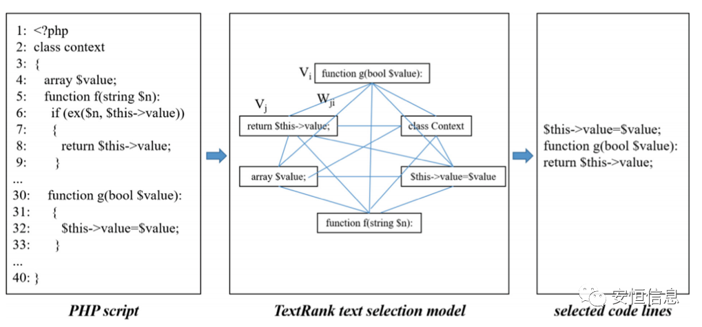 面對(duì)長(zhǎng)文本,論文采用了textrank模型來(lái)篩選重要語(yǔ)義信息,該算法可以通過(guò)相似度加權(quán)迭代的方式對(duì)代碼進(jìn)行重要性排序。