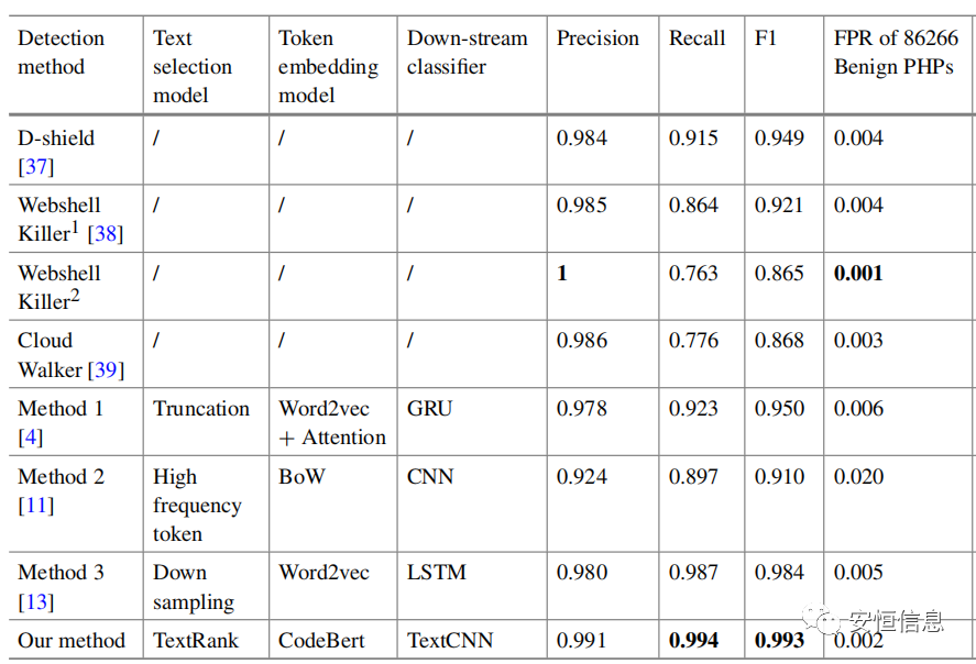 模型經(jīng)過(guò)數(shù)十epoch的訓(xùn)練,在數(shù)十萬(wàn)樣本的測(cè)試中,其綜合表現(xiàn)F1-score超過(guò)了3種webshell檢測(cè)工具和3種基于深度學(xué)習(xí)的webshell檢測(cè)模型。在達(dá)到較高檢出率的同時(shí),也保證了較低的誤報(bào)率。