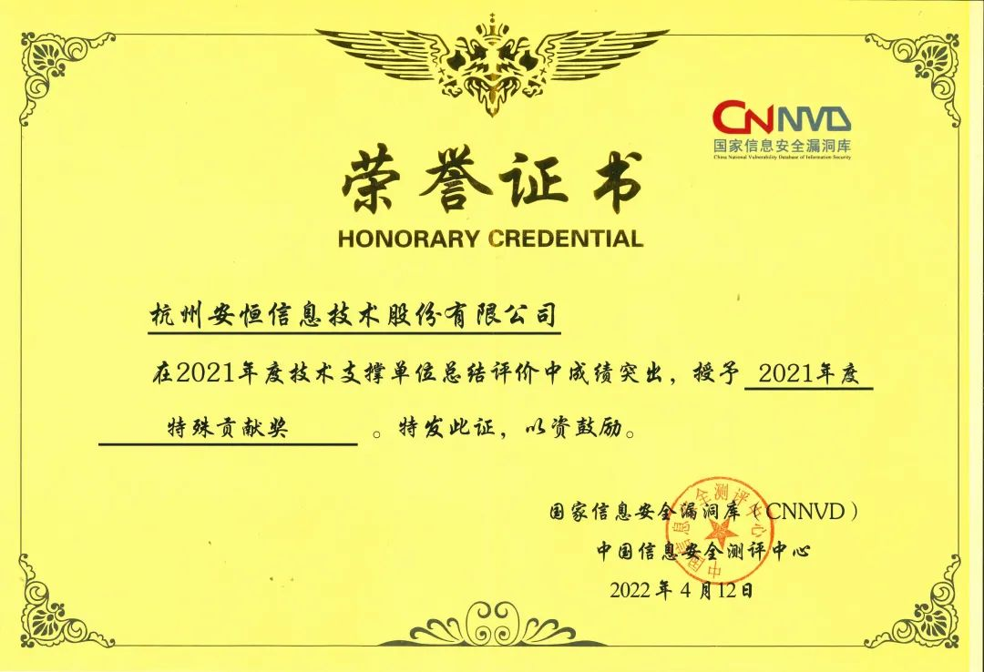 自2014年成為首批入選國(guó)家信息安全漏洞一級(jí)支撐單位的廠商以來(lái),安恒信息積極為CNNVD提交重要數(shù)據(jù)漏洞,多年來(lái),憑借實(shí)力和豐富經(jīng)驗(yàn)先后獲得來(lái)自CNNVD的多項(xiàng)榮譽(yù)。2021年,安恒信息榮獲CNNVD頒發(fā)的“2021年度特殊貢獻(xiàn)獎(jiǎng)”和“2021年度優(yōu)秀技術(shù)支撐單位”,不斷支持國(guó)家漏洞庫(kù)的建設(shè),助力信息安全漏洞研究。