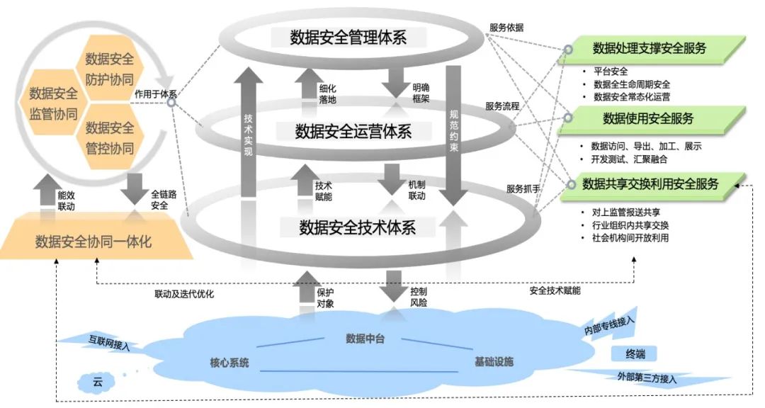 自數(shù)據(jù)安全體系化治理概念推出以來,安恒信息一直在實(shí)踐中不斷更新迭代方法論,從“前期-數(shù)據(jù)安全頂層規(guī)劃、中期-數(shù)據(jù)安全治理落地、后期-數(shù)據(jù)安全持續(xù)運(yùn)營”三段論中提煉出更具象化的、落地性質(zhì)的咨詢理念,圍繞數(shù)據(jù)安全防護(hù)、管控、監(jiān)管三大協(xié)同一體化機(jī)制,作用于數(shù)據(jù)安全管理、運(yùn)營、技術(shù)三大體系架構(gòu),延伸出數(shù)據(jù)處理支撐、使用、共享交換利用三大安全服務(wù)領(lǐng)域,持續(xù)為客戶提供管理抓手、技術(shù)賦能、運(yùn)營聯(lián)動(dòng),保障全鏈路全場景的數(shù)據(jù)安全。
