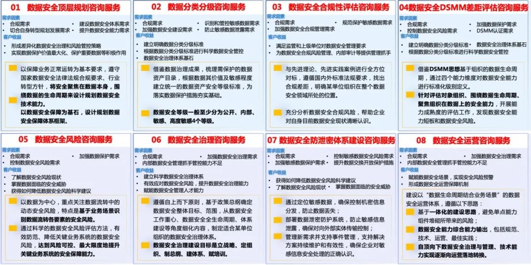 安恒信息數(shù)據(jù)安全咨詢服務(wù)體系自發(fā)布以來,旨在深度參與客戶數(shù)據(jù)安全體系規(guī)劃、建設(shè)落地到運(yùn)營的全過程,持續(xù)提升數(shù)據(jù)安全能力成熟度水平,其完整的主線可以概括成“設(shè)目標(biāo)、定框架、數(shù)分類、數(shù)分級(jí)、看現(xiàn)狀、識(shí)風(fēng)險(xiǎn)、立制度、設(shè)策略、制架構(gòu)、落能力、融流程、驗(yàn)效果”??商峁┑暮诵姆?wù)包括八大類:數(shù)據(jù)安全頂層規(guī)劃、分類分級(jí)、合規(guī)評(píng)估、DSMM差距評(píng)估、風(fēng)險(xiǎn)評(píng)估、治理咨詢、防泄密體系、運(yùn)營體系設(shè)計(jì)咨詢服務(wù)。?