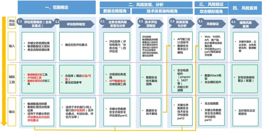 安恒信息結(jié)合金融、運(yùn)營商等重點(diǎn)行業(yè)內(nèi)客戶真實(shí)技術(shù)需求,利用已有技術(shù)、服務(wù)、工具等,內(nèi)部進(jìn)行多次專題研討開發(fā),總結(jié)出基于業(yè)務(wù)場景的數(shù)據(jù)安全風(fēng)險(xiǎn)評(píng)估落地方法思路。??