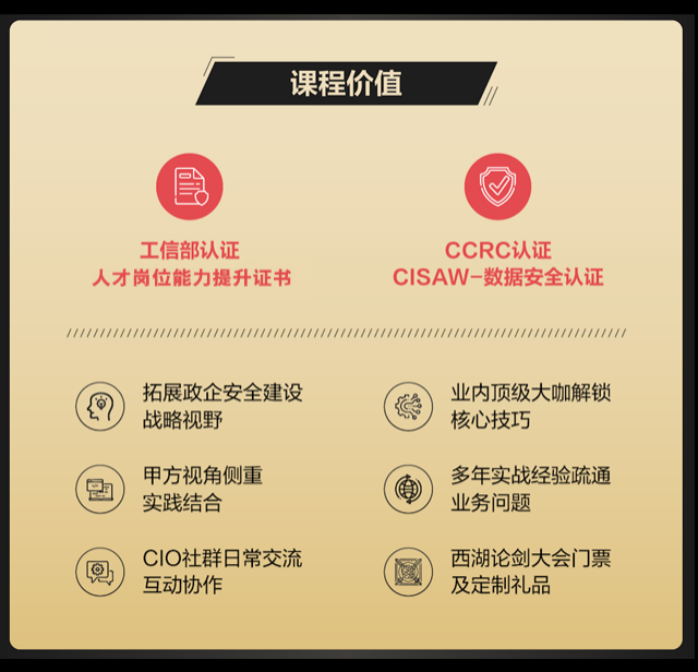 課程內(nèi)容簡介:數(shù)字安全官高級研修班,旨在為有志于未來成為政企單位CSO、CIO、數(shù)字安全負責人等從業(yè)人員提供專業(yè)、特色的精品培訓。課程聚焦政府企業(yè)在數(shù)字化轉(zhuǎn)型過程中面臨的挑戰(zhàn)與風險,剖析數(shù)字化轉(zhuǎn)型的本質(zhì)與內(nèi)涵,從甲方視角結(jié)合企業(yè)實踐經(jīng)驗分享數(shù)字化轉(zhuǎn)型的具體推進路徑與舉措。深度分析數(shù)字經(jīng)濟背景下數(shù)據(jù)安全領(lǐng)域立法背景,解讀熱點、要點內(nèi)容,分析立法發(fā)展趨勢;結(jié)合“數(shù)據(jù)二十條“意見要求,講解數(shù)據(jù)要素新特性及其對數(shù)據(jù)要素市場的影響,數(shù)據(jù)要素流通、交易和應(yīng)用的現(xiàn)狀與實踐。通過行業(yè)內(nèi)的意見領(lǐng)袖,分享政策法規(guī)、技術(shù)創(chuàng)新、落地實踐中的經(jīng)典案例與經(jīng)驗。