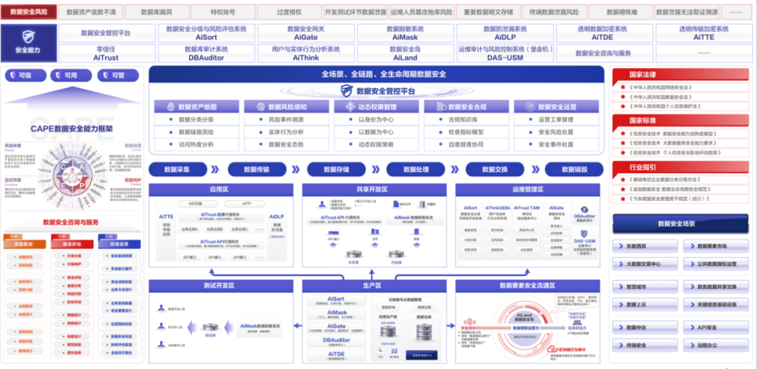 安恒數(shù)盾數(shù)據(jù)安全解決方案適用全國一體化大數(shù)據(jù)體系數(shù)據(jù)安全保障的采集、傳輸、存儲、處理、交換等各類場景。我們認(rèn)為數(shù)據(jù)安全安全保障需要從訪問、數(shù)據(jù)、基礎(chǔ)設(shè)施綜合設(shè)計。數(shù)據(jù)安全保障體系可結(jié)合整個零信任體系,結(jié)合數(shù)據(jù)安全的全流程管控、追溯體系,結(jié)合數(shù)據(jù)安全的動態(tài)行為分析,結(jié)合數(shù)據(jù)安全的加密和保護,結(jié)合數(shù)據(jù)安全的全流程CAPE數(shù)據(jù)安全能力框架,結(jié)合數(shù)據(jù)安全規(guī)劃設(shè)計,讓它系統(tǒng)性、全流程、平臺化全場景進行實時防護。安恒信息集成了體系化的政府?dāng)?shù)字化轉(zhuǎn)型的安全經(jīng)驗,真正能夠在可信、可用、可管、可溯源的體系中保障數(shù)據(jù)全場景、全鏈路、全生命周期的安全,以及實現(xiàn)數(shù)據(jù)的可用不可見、可用不可取,為全國一體化政務(wù)大數(shù)據(jù)進行賦能,激活數(shù)據(jù)潛能,釋放數(shù)據(jù)價值。