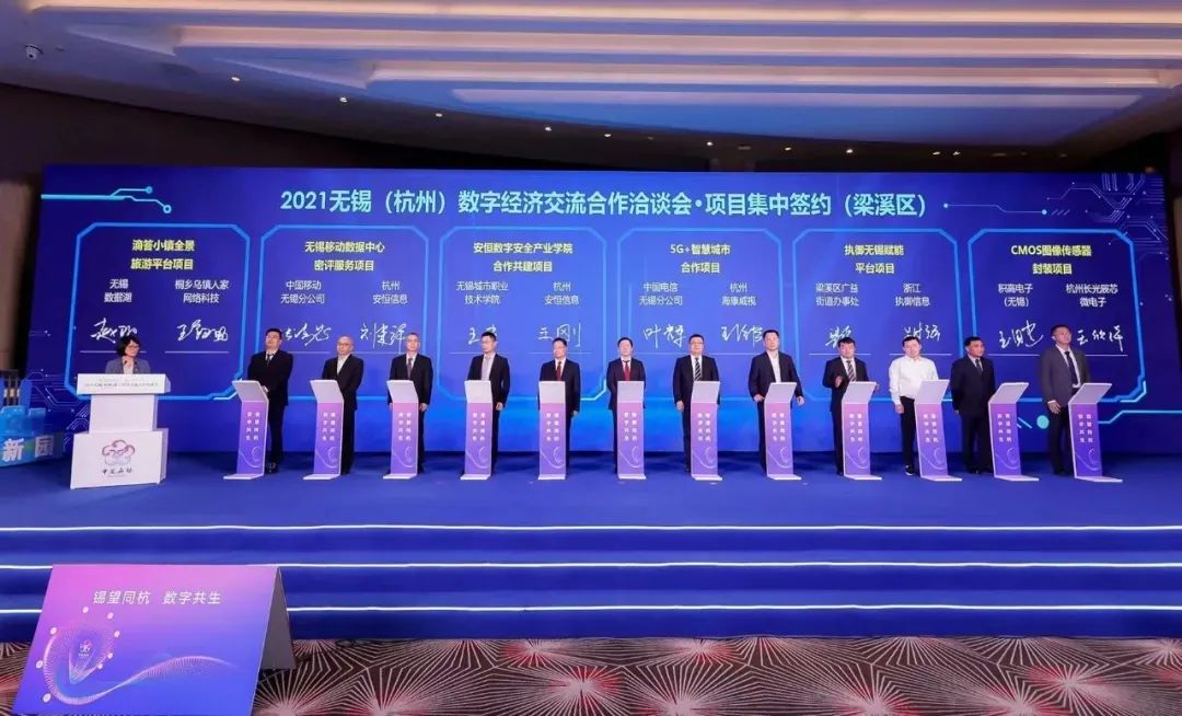 2021年10月8日,2021無錫(杭州)數(shù)字經(jīng)濟(jì)交流合作洽談會(huì)在杭州舉行。無錫市代市長(zhǎng)趙建軍出席活動(dòng)并致辭,副市長(zhǎng)高亞光主持。安恒信息在本次洽談會(huì)中簽約合作。