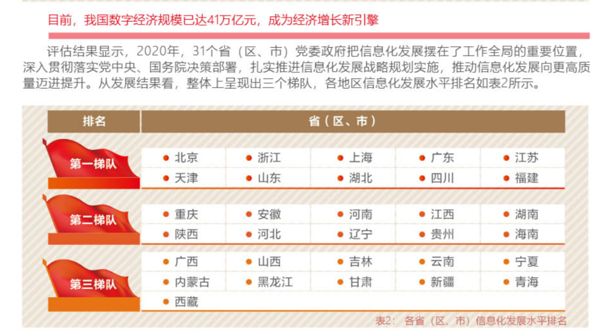 國家網(wǎng)信辦組織有關(guān)單位,結(jié)合國家統(tǒng)計(jì)局、工業(yè)和信息化部、中央黨校(國家行政學(xué)院)、人力資源社會(huì)保障部、中國互聯(lián)網(wǎng)絡(luò)信息中心(CNNIC)等部門和機(jī)構(gòu)的統(tǒng)計(jì)數(shù)據(jù)和評(píng)價(jià)指數(shù),開展了2020年各地區(qū)信息化發(fā)展評(píng)估工作,重點(diǎn)評(píng)估了31個(gè)?。▍^(qū)、市)信息服務(wù)應(yīng)用、信息技術(shù)產(chǎn)業(yè)、產(chǎn)業(yè)數(shù)字化、信息基礎(chǔ)設(shè)施、信息安全、發(fā)展環(huán)境等方面的發(fā)展水平。結(jié)果顯示,2020年31個(gè)?。▍^(qū)、市)黨委政府把信息化發(fā)展擺在了工作全局的重要位置,深入貫徹落實(shí)黨中央、國務(wù)院決策部署,扎實(shí)推進(jìn)信息化發(fā)展戰(zhàn)略規(guī)劃實(shí)施,推動(dòng)信息化發(fā)展向更高質(zhì)量邁進(jìn)提升。從發(fā)展結(jié)果看,整體上呈現(xiàn)出三個(gè)梯隊(duì),各地區(qū)信息化發(fā)展水平排名如表所示。
