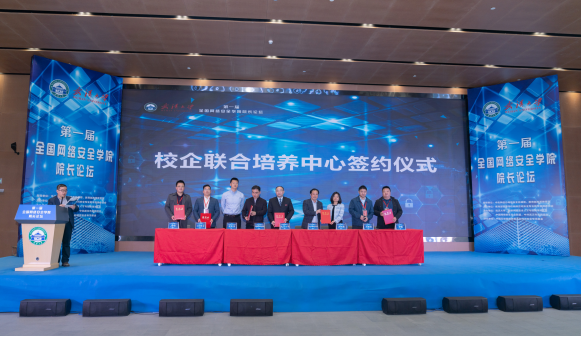 會(huì)議期間,國家網(wǎng)絡(luò)安全人才與創(chuàng)新基地、武漢大學(xué)、華中科技大學(xué)與安恒信息等六家企業(yè)簽署協(xié)議,共同發(fā)起成立校企聯(lián)合培養(yǎng)中心,為校企合作育人提供重要平臺(tái)。