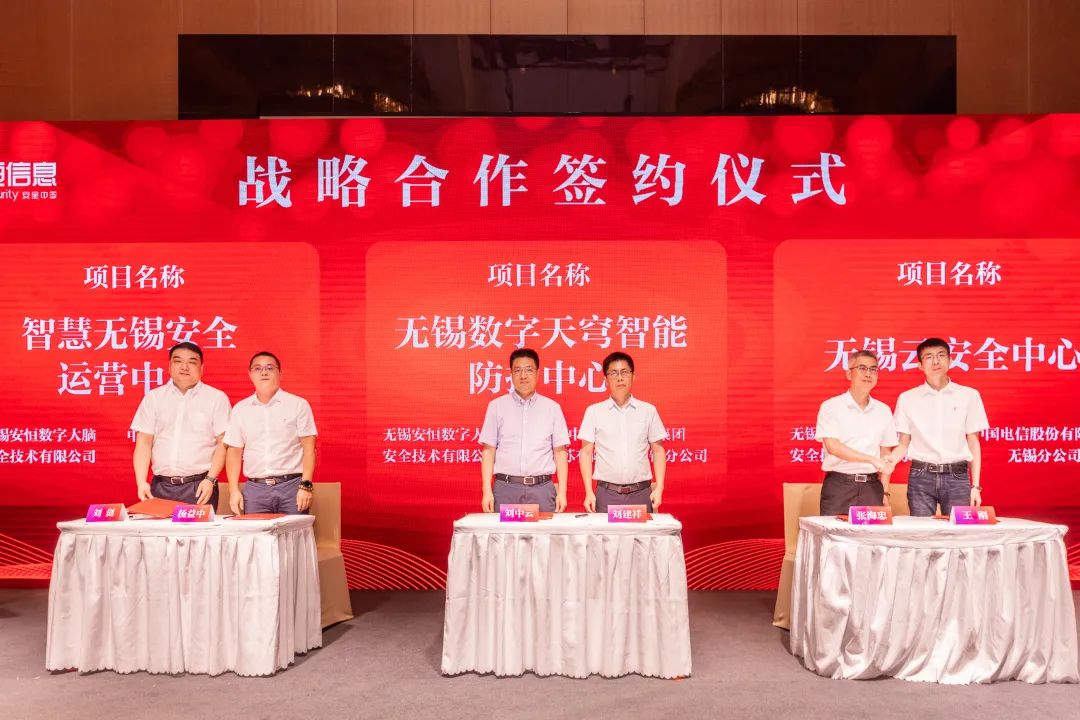 ▲ 安恒信息區(qū)域總部分別與中國聯(lián)合通信有限公司無錫分公司、中國移動通信集團(tuán)江蘇有限公司無錫分公司、中國電信股份有限公司無錫分公司簽署戰(zhàn)略合作協(xié)議