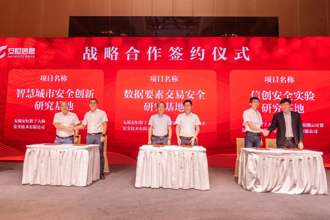 ▲ 安恒信息區(qū)域總部分別與朗新智城科技有限公司、無錫數(shù)據(jù)湖信息技術(shù)有限公司、無錫浪潮云計(jì)算有限公司簽署戰(zhàn)略合作協(xié)議