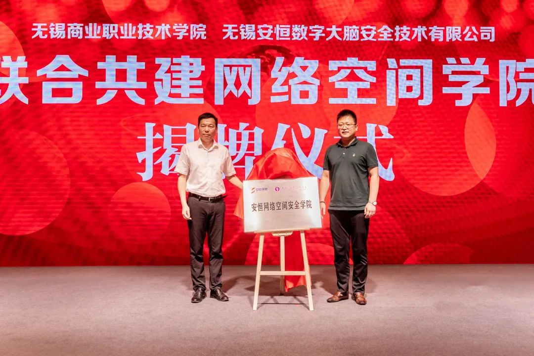 ▲ 安恒信息區(qū)域總部與無錫商業(yè)職業(yè)技術(shù)學(xué)院聯(lián)合共建網(wǎng)絡(luò)空間學(xué)院的揭牌儀式