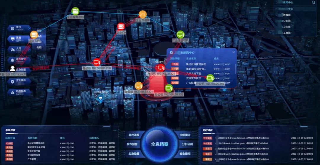以網(wǎng)絡(luò)空間地圖可視化為基礎(chǔ),融入網(wǎng)絡(luò)空間關(guān)系、網(wǎng)絡(luò)空間資產(chǎn)數(shù)據(jù)、、網(wǎng)絡(luò)安全隱患、網(wǎng)絡(luò)安全事件、從單位、資產(chǎn)、系統(tǒng)、事件等維度豐富可視化表達(dá),全面展示和描述網(wǎng)絡(luò)空間資源的分布和屬性,實(shí)現(xiàn)網(wǎng)絡(luò)空間要素的可視化表達(dá)。