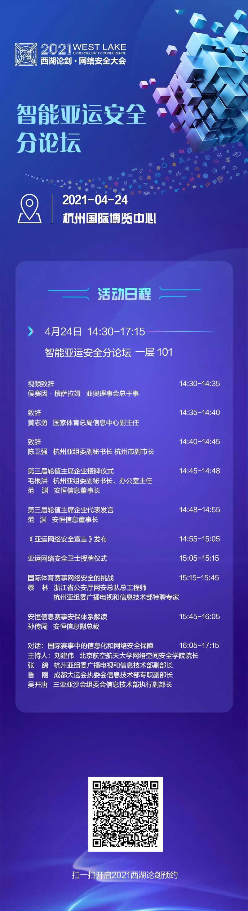 2021年4月24日,2021西湖論劍?網(wǎng)絡(luò)安全大會新增智能亞運安全分論壇,這是首個聚焦賽事網(wǎng)絡(luò)安全服務(wù)的盛會,邀請了國內(nèi)外知名專家為亞運網(wǎng)絡(luò)安全建言獻策。在現(xiàn)場,將由亞奧理事會總干事遠程視頻連線致辭。