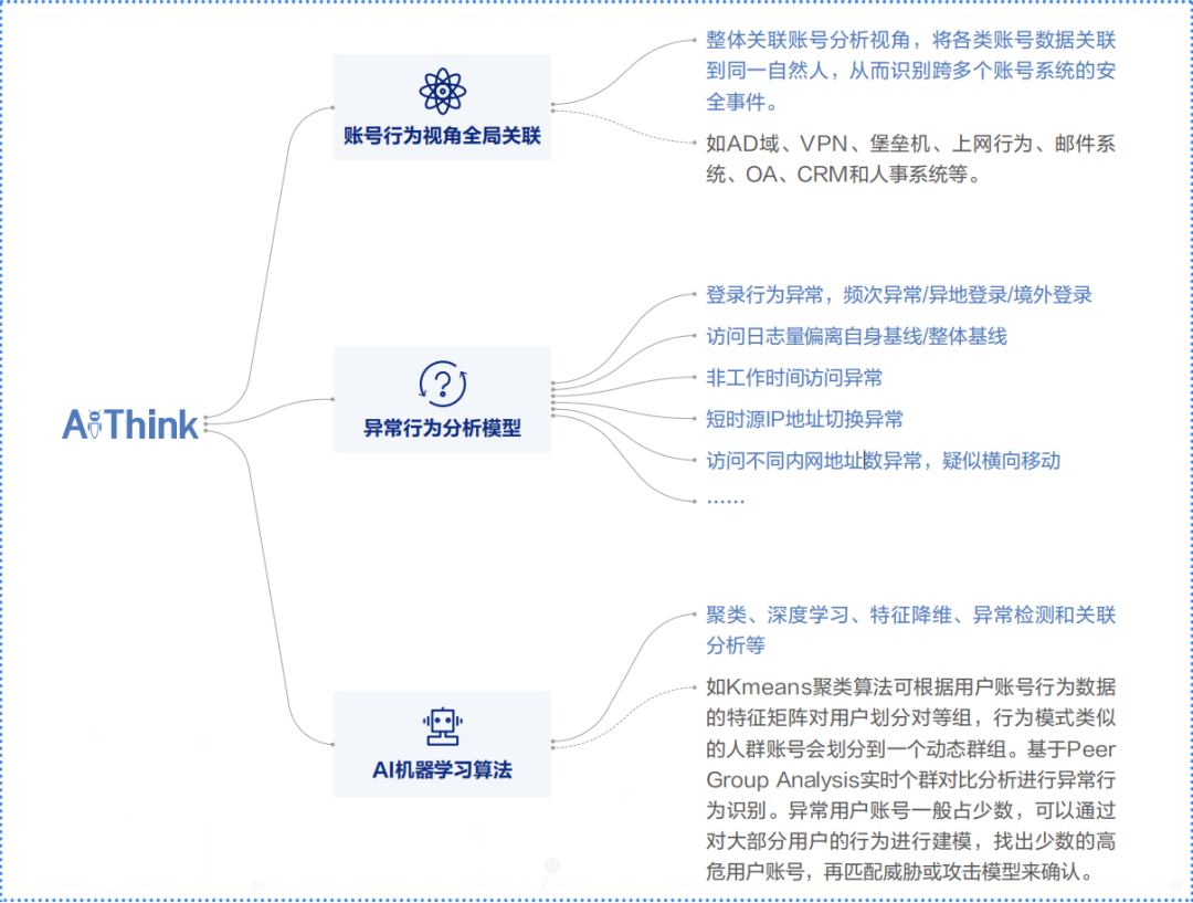 對賬號異常行為的監(jiān)控、檢測和分析正是AiThink UEBA用戶與實體行為分析技術(shù)的特長,通過收集整合全方位多維度以及用戶上下文等數(shù)據(jù)信息,全局關(guān)聯(lián),進(jìn)行行為基線分析和群體異常分析,通過AI機(jī)器學(xué)習(xí)異常檢測算法,可以更深層次的進(jìn)行賬號安全洞察,迅速識別異常事件。