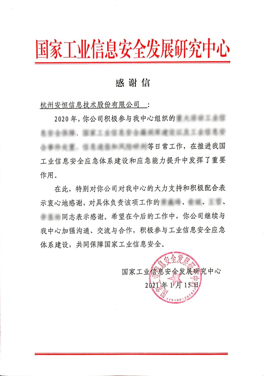 榮耀二連!安恒信息連續(xù)兩年收到「國(guó)家工業(yè)信息安全發(fā)展研究中心」感謝信