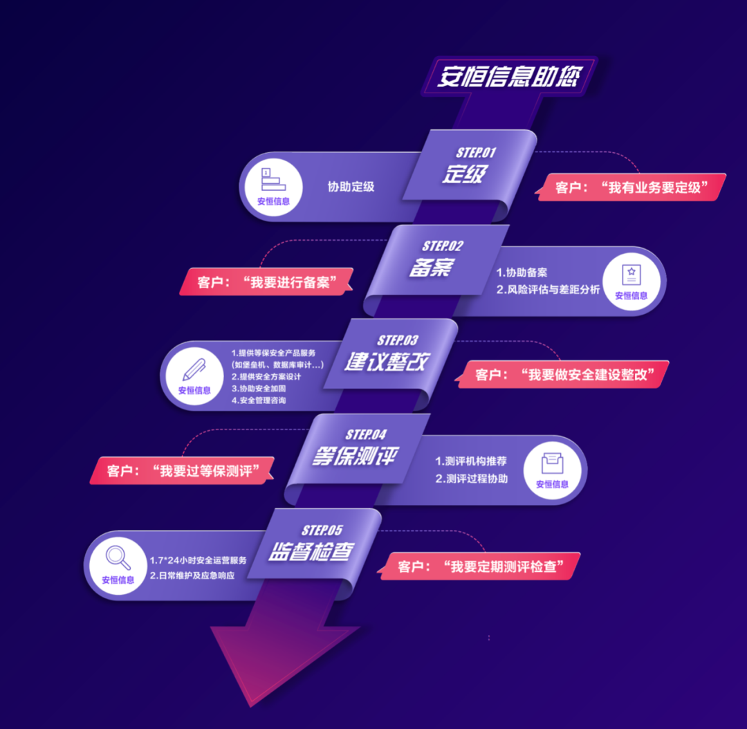 3、等保測評階段:安恒信息覆蓋全國的等保測評機構生態(tài)網絡,為您推薦專業(yè)的測評公司,快速過等保。