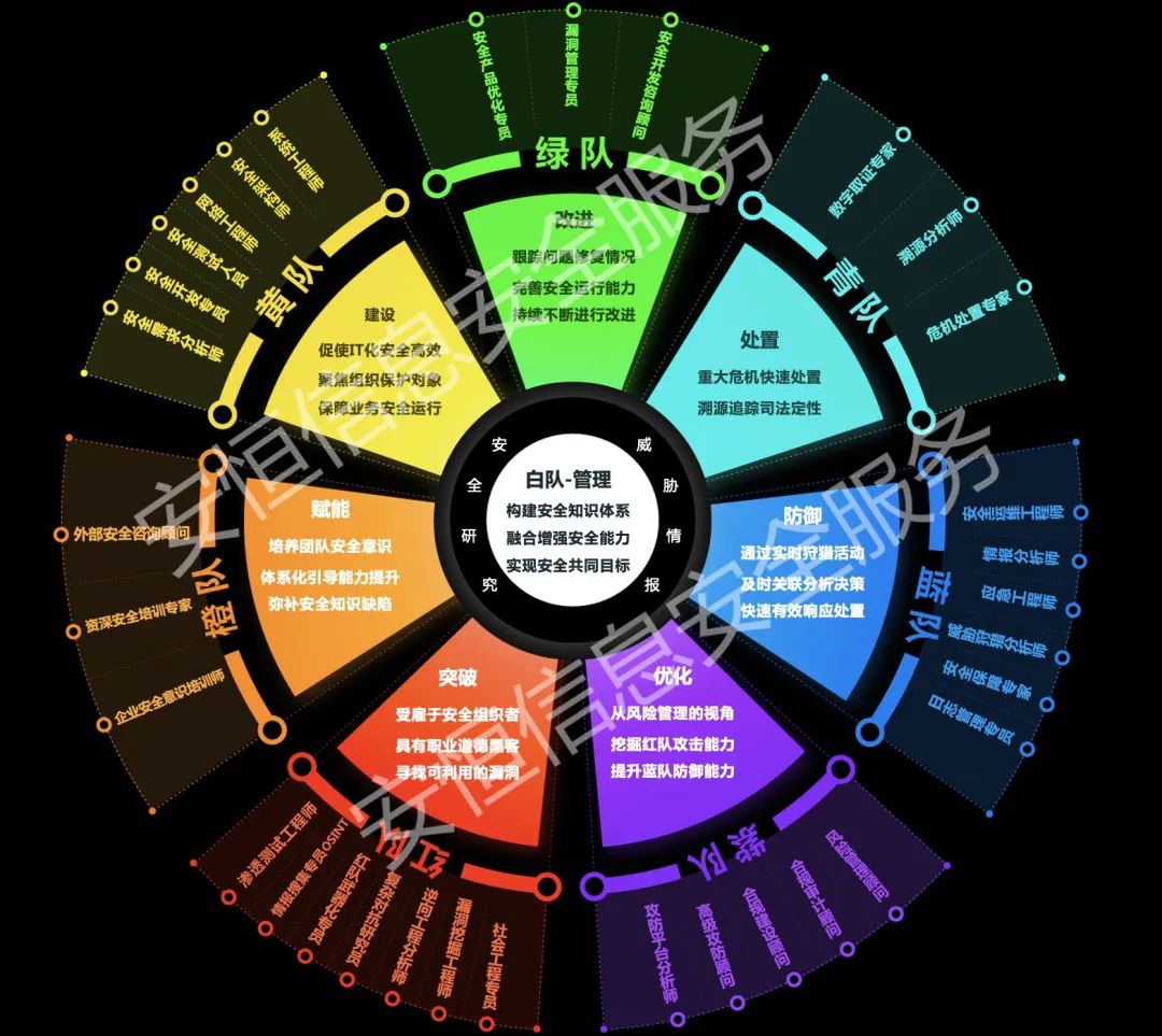 安恒信息安全服務(wù)團(tuán)隊(duì)由九維安全能力專家構(gòu)成,其職責(zé)分別為:紅隊(duì)持續(xù)突破、橙隊(duì)擅于賦能、黃隊(duì)致力建設(shè)、綠隊(duì)跟蹤改進(jìn)、青隊(duì)快速處置、藍(lán)隊(duì)實(shí)時(shí)防御,紫隊(duì)不斷優(yōu)化、暗隊(duì)專注情報(bào)和研究、白隊(duì)運(yùn)營(yíng)管理,以體系化的安全人才及技術(shù)為客戶賦能。