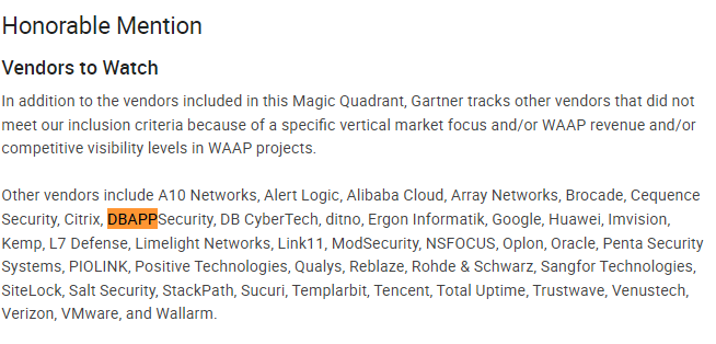 • 2021年在Gartner《Web應用防火墻魔力象限》報告中被榮譽提及