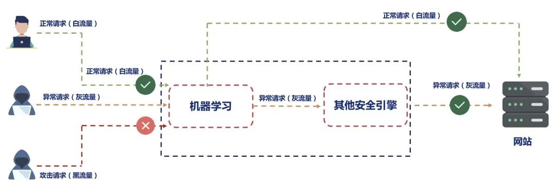 新一代智能WAF采用先進的機器學習算法模型,對Web業(yè)務系統(tǒng)建立正常的業(yè)務數(shù)據(jù)模型,并通過持續(xù)學習保持模型更新,實現(xiàn)對異常流量的檢測,由機器學習自主完成已知攻擊攻擊檢測和防御,并具備能感知未知威脅或誤報漏報的能力,使用戶脫離繁瑣的規(guī)則維護工作。