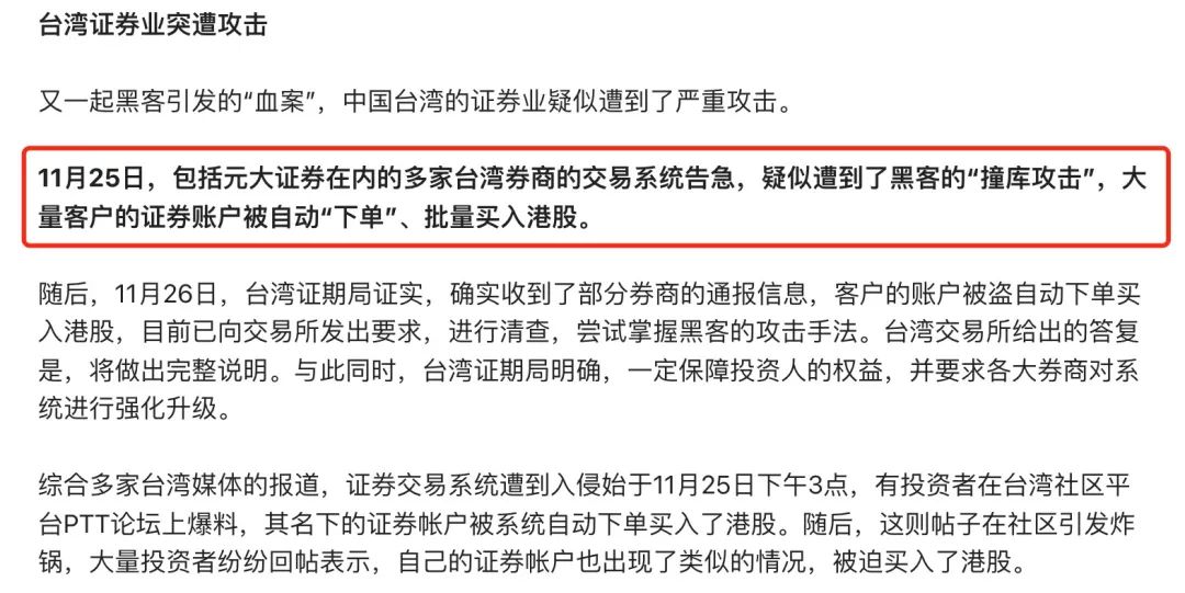 據(jù)臺灣省多家媒體報道,11月25日,包括中國臺灣省領(lǐng)先券商元大證券在內(nèi)的多家券商的交易系統(tǒng)涉嫌被黑客撞庫攻擊,大量客戶的證券賬戶自動下單,批量購買港股。僅在11月25日當(dāng)天,深藍(lán)科技股價遭遇暴跌,單日跌幅高達(dá)33%。