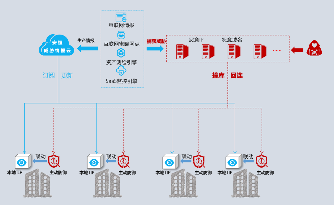 我們常用的主動防御技術(shù)有蜜罐狩獵、自動漏掃、入侵防護(hù)、流量檢測、訪問控制、大數(shù)據(jù)分析等等,但都無法全面覆蓋層出不窮的新型的、持續(xù)的、高級的網(wǎng)絡(luò)攻擊。我們需要利用具備網(wǎng)絡(luò)攻擊行為證據(jù)且具有威脅指標(biāo)的情報知識庫,提升不同場景中的防御技術(shù)對高級威脅和未知威脅的防御能力。