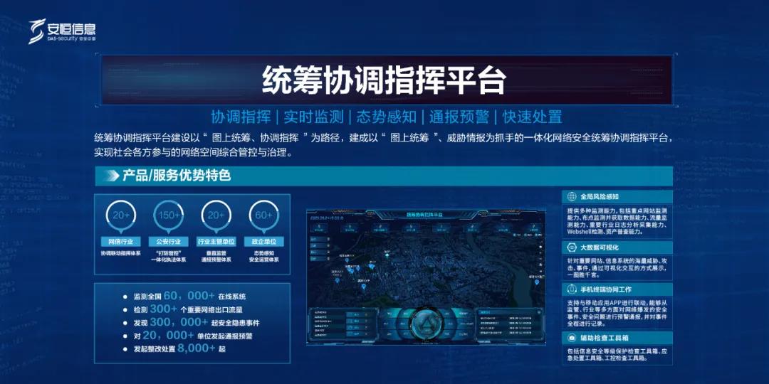 本次成果展,安恒信息在威脅情報展示區(qū)重點展示了統(tǒng)籌協(xié)調(diào)指揮平臺。該平臺建設以“圖上統(tǒng)籌、協(xié)調(diào)指揮”為路徑,建成以“圖上統(tǒng)籌”、威脅情報為抓手的一體化網(wǎng)絡安全統(tǒng)籌協(xié)調(diào)指揮平臺,實現(xiàn)社會各方參與的網(wǎng)絡空間綜合管控與治理。