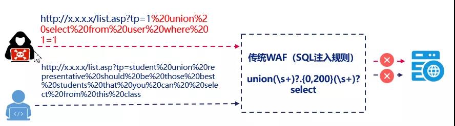 傳統(tǒng)基于靜態(tài)簽名規(guī)則的WAF應(yīng)對這種情況就存在兩難的問題:要么嚴格限制,這樣就會導(dǎo)致正常用戶請求誤攔截;要么寬松限制,這樣則會導(dǎo)致攻擊請求被放過,難以兩全。