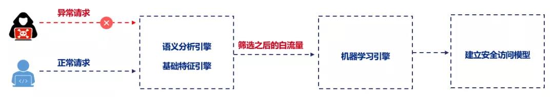 - 訪問流量與安全模型無偏離度或者偏離度較小則屬于白流量,無需經(jīng)過安全引擎將流量直接放行