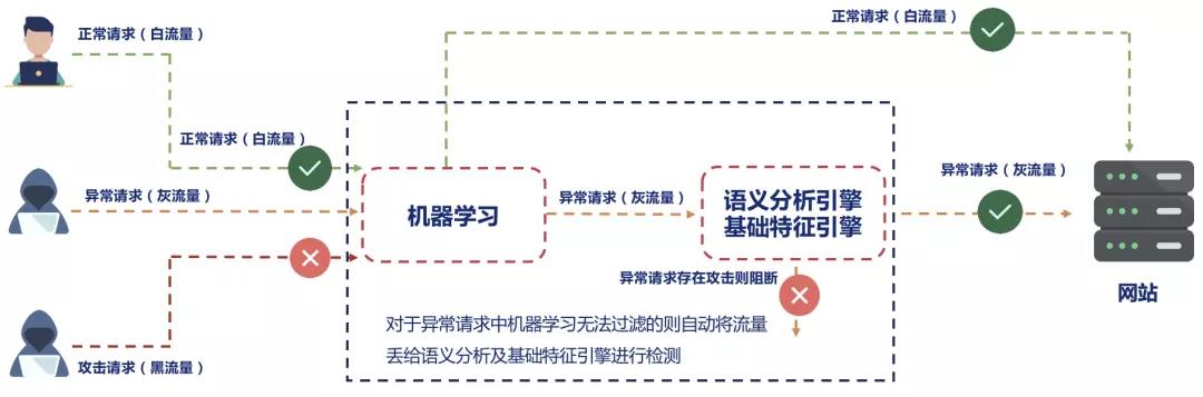 機器學(xué)習(xí)完成進入檢測模式后,依據(jù)“量身定做”的安全模型識別黑、灰、白三種不同流量,進而針對安全性的不同采取不同的處理策略,在高效保障正常業(yè)務(wù)訪問的同時,可以有效識別并阻斷0day等未知威脅訪問,為用戶的Web安全保駕護航!
