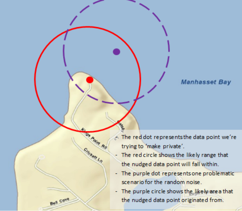 如何精確生成私人地圖?利用差分隱私將每個數(shù)據(jù)點微移一點(如紅點)