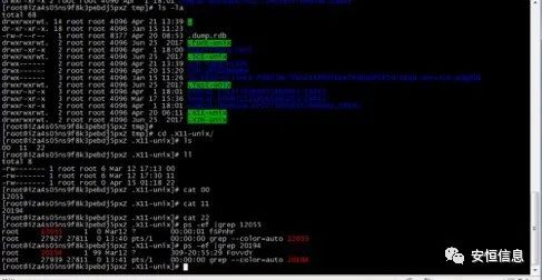 6、從解密的病毒文件中還可看到惡意程序守護(hù)進(jìn)程相關(guān)的信息存放在/tmp/.X11-unix下,進(jìn)入該目錄可查看惡意進(jìn)程的ID,手動刪除該文件并kill相關(guān)進(jìn)程。