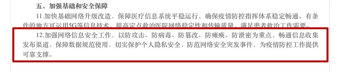 通知強(qiáng)調(diào)了,要從強(qiáng)化數(shù)據(jù)采集分析、積極開(kāi)展遠(yuǎn)程醫(yī)療服務(wù)、規(guī)范互聯(lián)網(wǎng)診療咨詢(xún)服務(wù)、深化“互聯(lián)網(wǎng)+”政務(wù)服務(wù)、加強(qiáng)基礎(chǔ)和安全保障五個(gè)方面加強(qiáng)信息化支撐疫情防控工作。其中第12條明確指示,“加強(qiáng)網(wǎng)絡(luò)信息安全工作,以防攻擊、防病毒、防篡改、防癱瘓、防泄密為重點(diǎn),暢通信息收集發(fā)布渠道,保障數(shù)據(jù)規(guī)范使用,切實(shí)保護(hù)個(gè)人隱私安全,防范網(wǎng)絡(luò)安全突發(fā)事件,為疫情防控工作提供可靠支撐?!?/p>