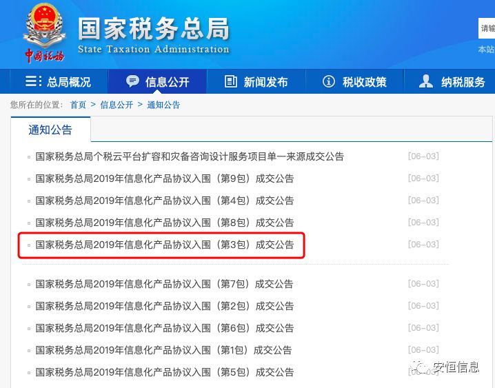 6月3日,國家稅務(wù)總局發(fā)布“國家稅務(wù)總局2019年信息化產(chǎn)品協(xié)議入圍成交公告”。