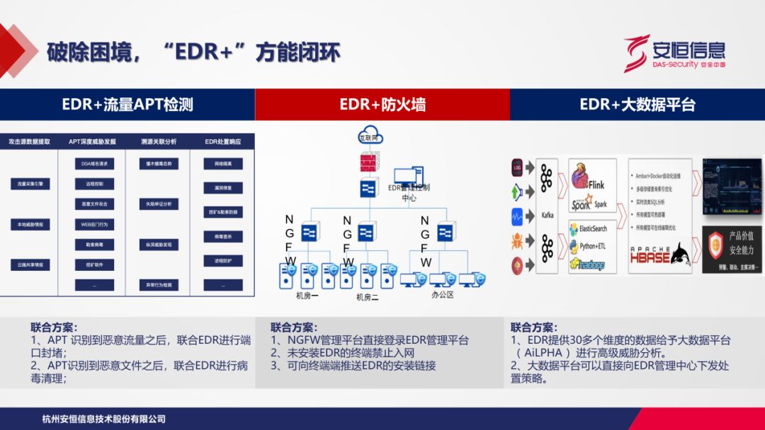 在用戶網(wǎng)絡(luò)環(huán)境中,存在海量端點(diǎn)。EDR與APT流量檢測(cè)類產(chǎn)品聯(lián)合,如同由點(diǎn)連線;與防火墻產(chǎn)品聯(lián)合進(jìn)行終端安全管理,如同由線及面;與大數(shù)據(jù)平臺(tái)聯(lián)合進(jìn)行高級(jí)威脅分析,如同立體的堡壘。與多款產(chǎn)品相結(jié)合,幫助用戶進(jìn)行立體化網(wǎng)絡(luò)安全防護(hù)。