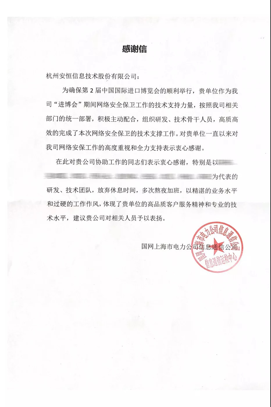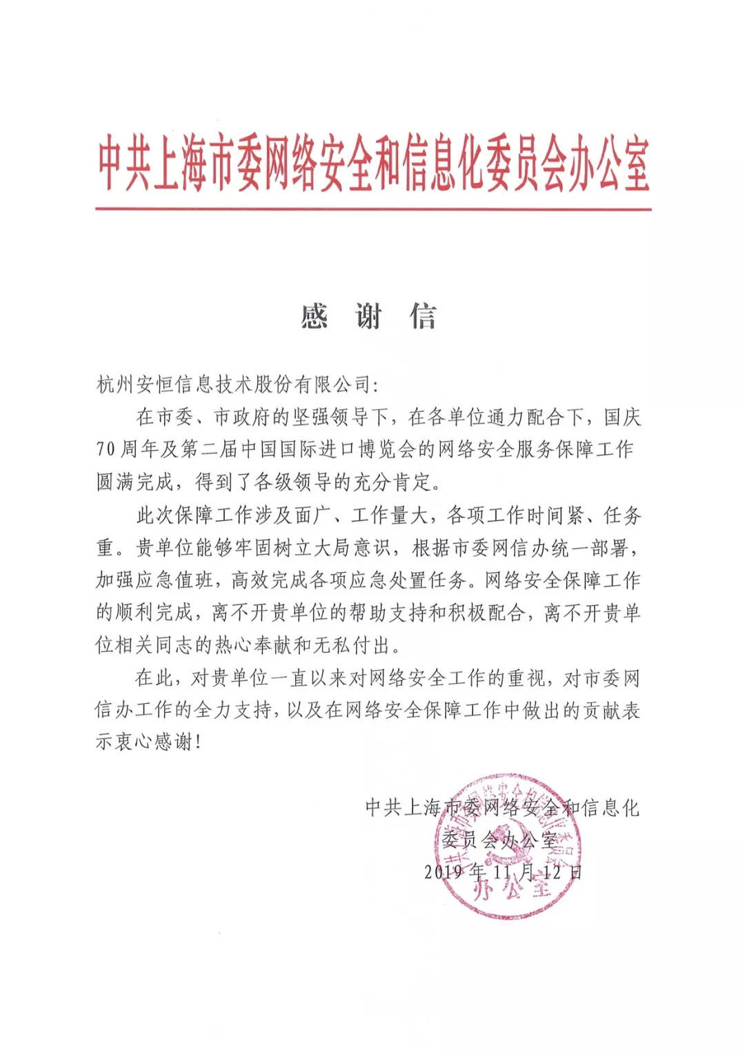 近日,我們收到這些感謝信,它們來自”中國國際進口博覽局、中共上海市委網(wǎng)絡安全和信息化委員會辦公室、上海市公安局智慧公安建設領導小組辦公室、浦東分局網(wǎng)絡安全保衛(wèi)支隊、閔行區(qū)進博會網(wǎng)絡安全工作組、國家會展中心(上海)、國網(wǎng)上海市電力公司信息通信公司......“