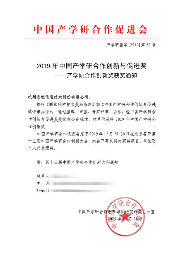 近日,中國產(chǎn)學(xué)研合作創(chuàng)新與促進(jìn)獎評獎辦公室發(fā)布關(guān)于2019產(chǎn)學(xué)研合作創(chuàng)新獎獲獎通知,安恒信息榮獲“2019年中國產(chǎn)學(xué)研合作創(chuàng)新獎”。