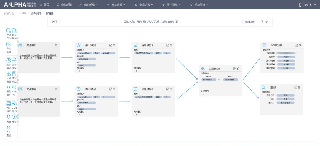 安恒AiLPHA大數(shù)據(jù)智能安全平臺將人工智能與SOAR結(jié)合,在醫(yī)療、教育、金融行業(yè)已經(jīng)取得很大成效。針對每一個主機(jī)建立流量行為基線,當(dāng)主機(jī)被遠(yuǎn)控木馬植入時,通過人工智能 RPCA-SST 算法濾除人為上網(wǎng)行為的噪聲,檢測出主機(jī)存在回連未知地址和數(shù)據(jù)泄露的特征,聯(lián)合EDR發(fā)現(xiàn)進(jìn)程存在文件篡改行為,研判分析其為變種木馬,自動下發(fā)EDR文件隔離策略和防火墻流量阻斷策略,及時阻斷數(shù)據(jù)泄露風(fēng)險。同時,調(diào)用Sherlock對木馬文件追蹤溯源,發(fā)現(xiàn)其通過釣魚郵件植入,辦公網(wǎng)中多個主機(jī)收到過同樣郵件。繼續(xù)聯(lián)動漏洞掃描器和EDR對相關(guān)資產(chǎn)進(jìn)行檢測與響應(yīng)。最終將該新型變種木馬的文件hash、遠(yuǎn)控域名、發(fā)件郵箱加入威脅情報庫,并將相關(guān)流量、日志和處置過程通過郵件通知安全管理員進(jìn)一步應(yīng)急分析。這一完整的對失陷終端的響應(yīng)過程就是SOAR創(chuàng)建的劇本,體現(xiàn)了SOAR如何動態(tài)實(shí)現(xiàn)編排與自動化。
